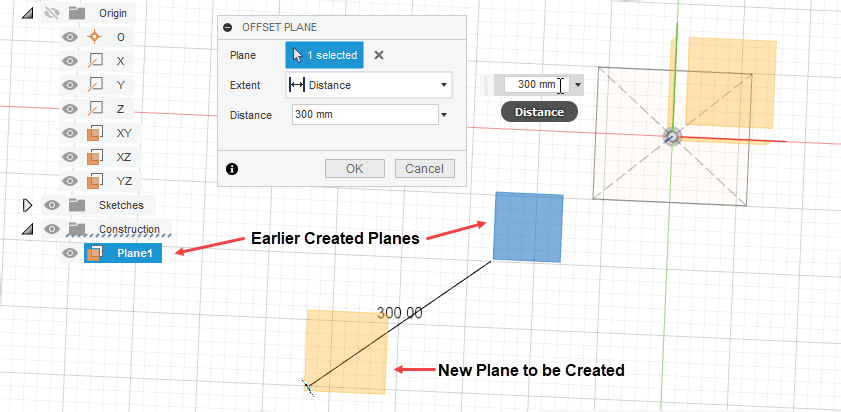 • Specify the distance value as 300 in OFFSET PLANE dialog box and click on the OK button. A new plane will be created at a distance of 300 from XY plane.