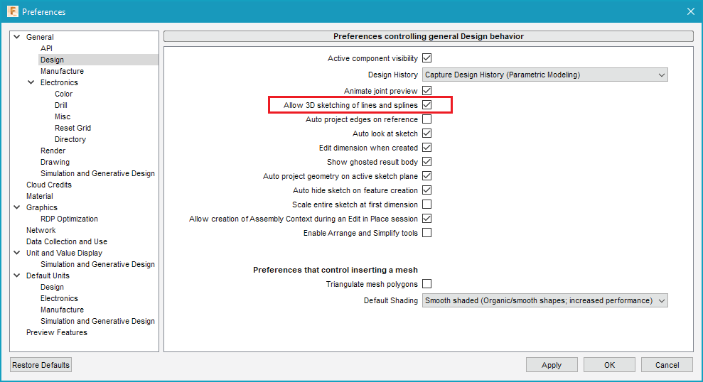 • Select the Allow 3D sketching of lines and splines check box as highlighted in above figure and click on the OK button from the dialog box.